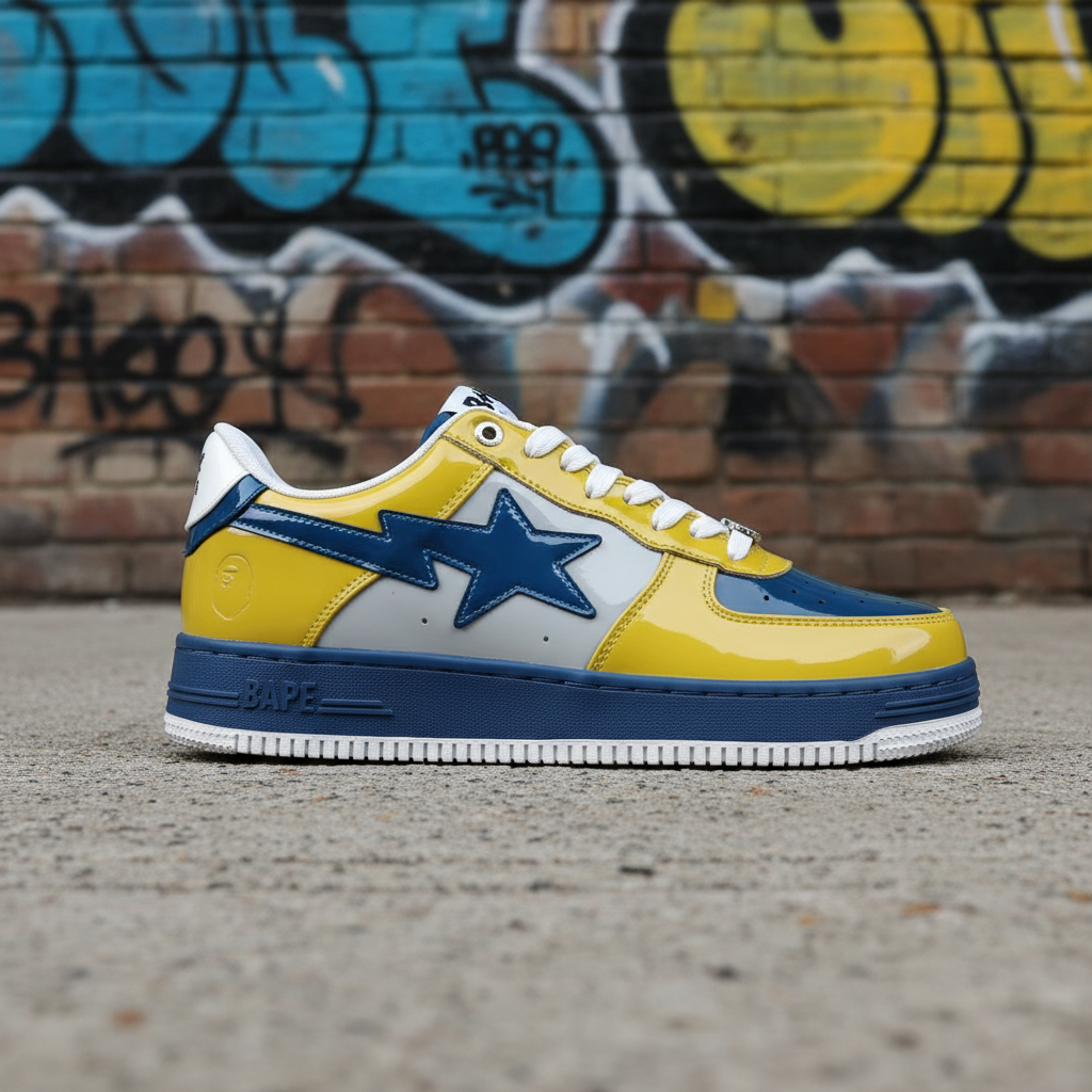 BAPE sneakers with glossy yellow, blue, and grey panels, iconic star logo, and premium design for streetwear style and everyday comfort.