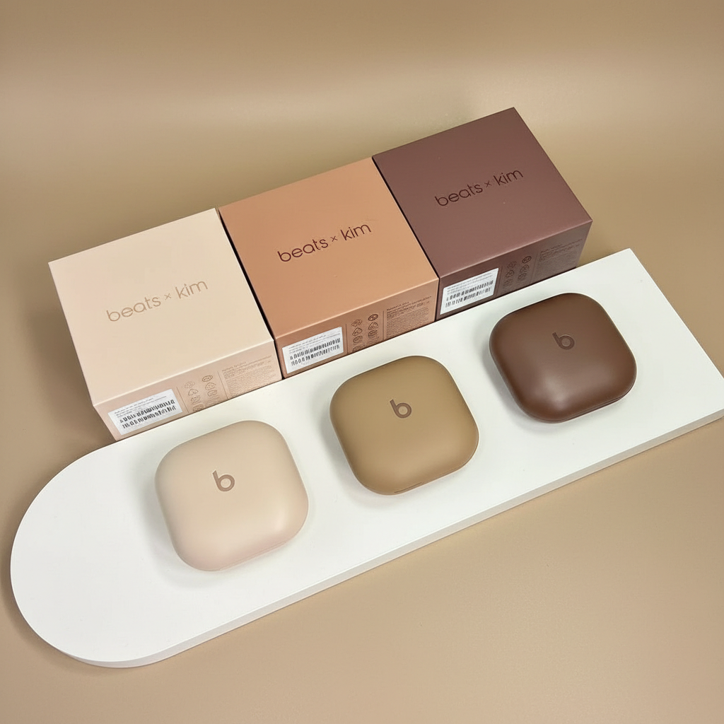 Beats x Kim wireless earbuds, stylish neutral tones, high-quality sound, Bluetooth connectivity, noise cancellation, perfect for music lovers and fashion-forward listeners.