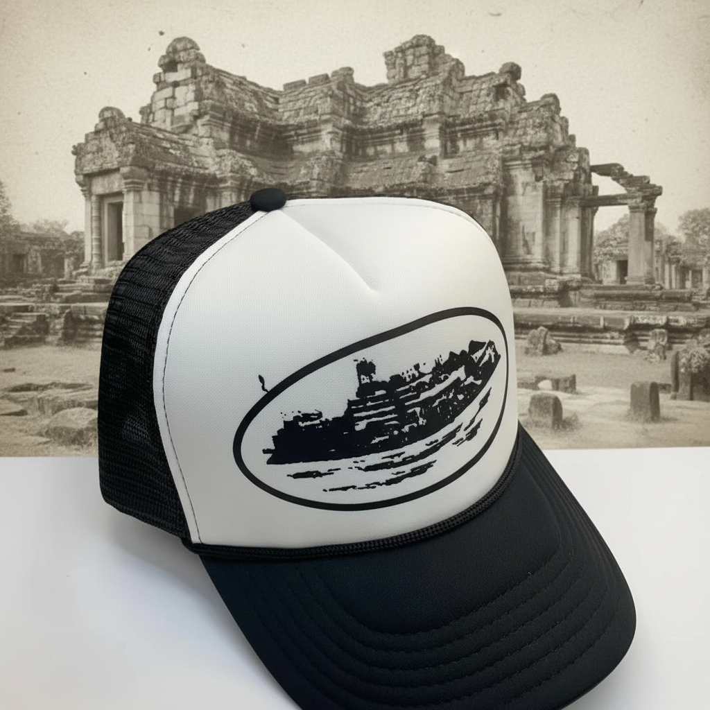 HatsOther Black and White Mesh Trucker Hat with Ship Print, Breathable Adjustable Baseball Cap for Outdoor Sports and Casual Wear
