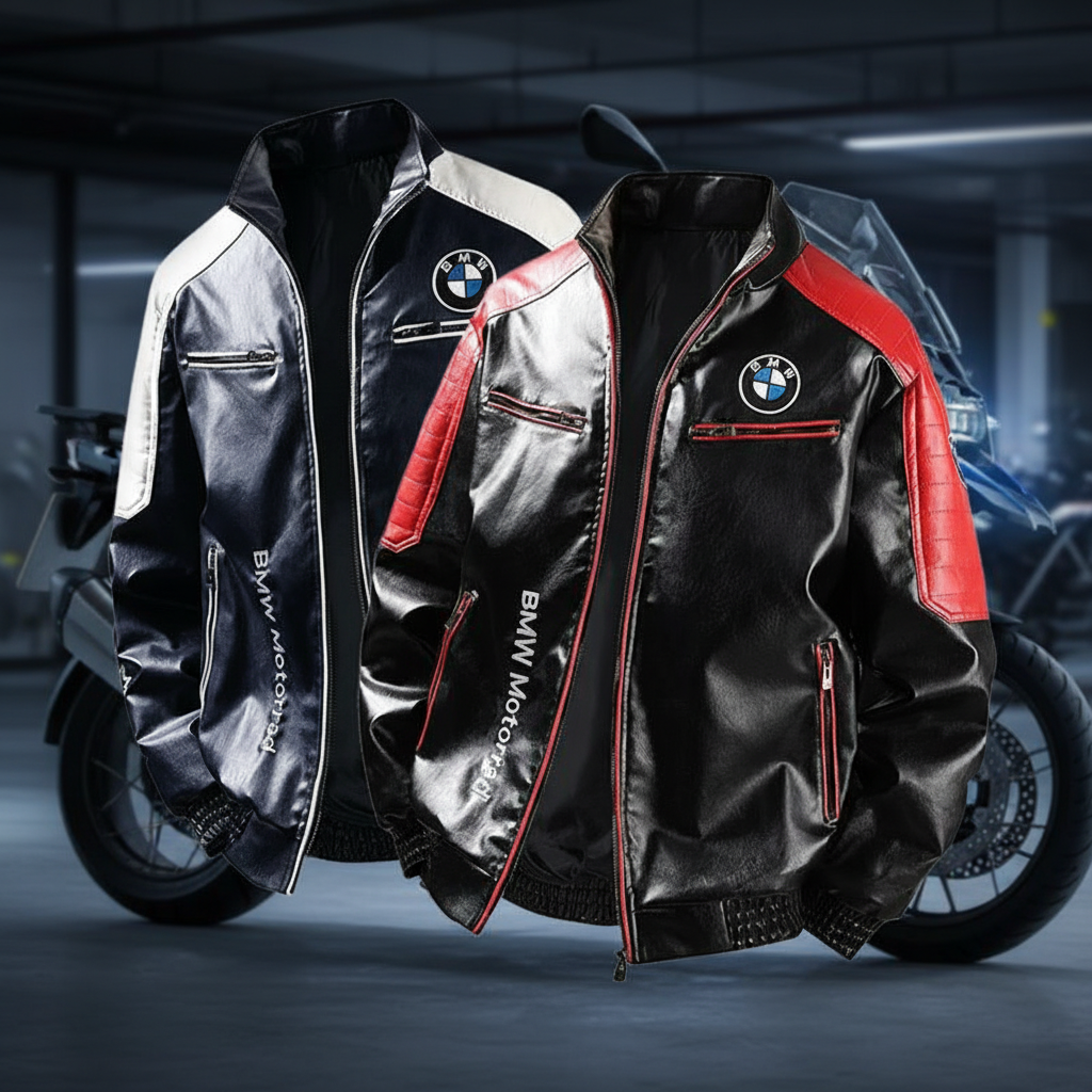BMW Motorrad Men’s Leather Motorcycle Jacket, Retro Racing Style Biker Coat with Zipper Pockets, Casual Outerwear for Riding and Fashion