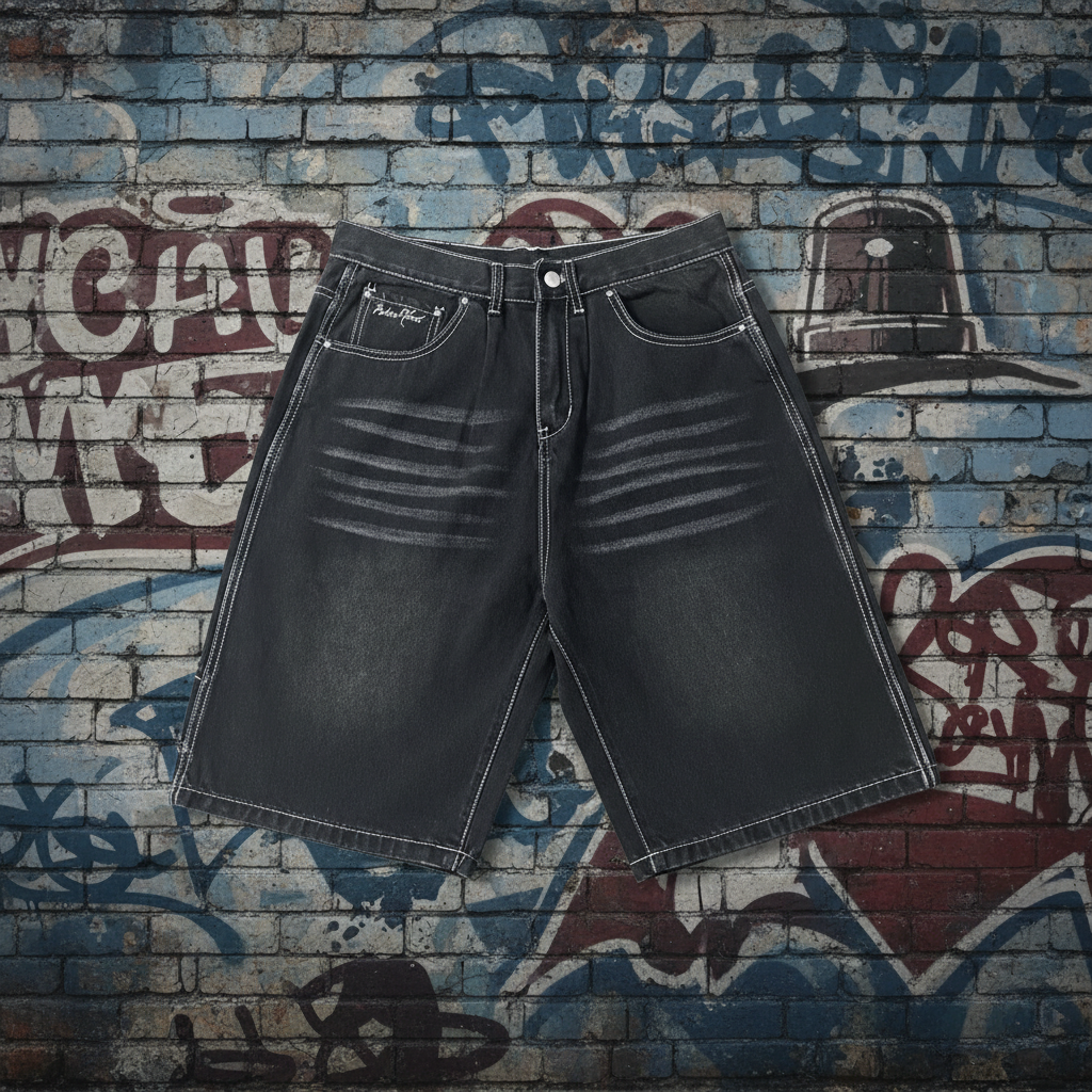 Broken Planet black denim shorts with distressed stripe design, relaxed fit, and classic five-pocket style for casual streetwear fashion.