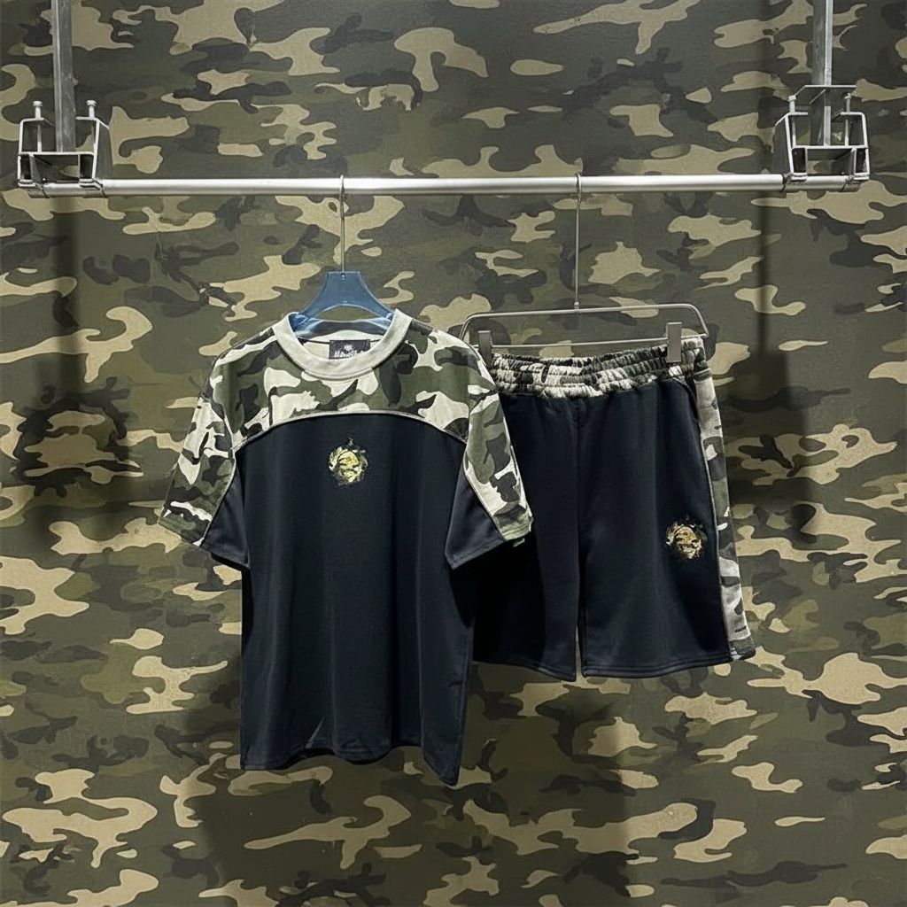 Broken Planet Camo Patchwork T-Shirt and Shorts Set, casual streetwear style with unique graphic print, perfect for summer comfort and urban fashion lovers.