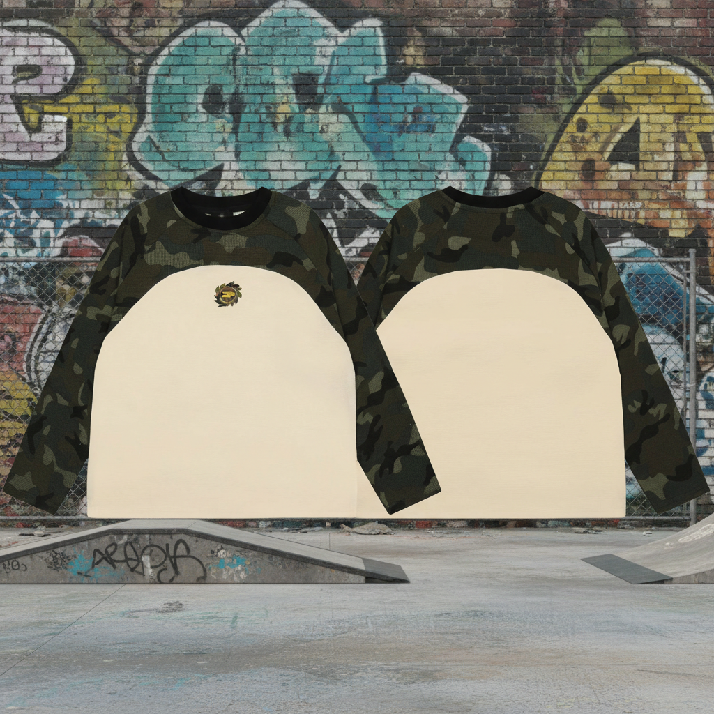 Broken Planet camo sleeve beige sweatshirt, stylish streetwear with unique lion logo, perfect for casual wear and outdoor adventures.