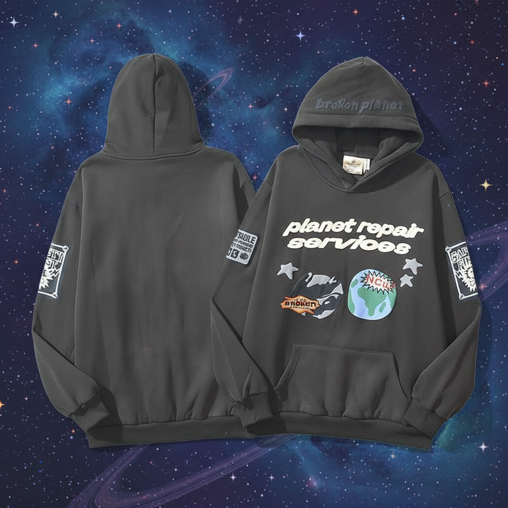 Broken Planet hoodie with graphic planet repair design, soft cotton blend, casual streetwear style, perfect for everyday wear and urban fashion lovers.