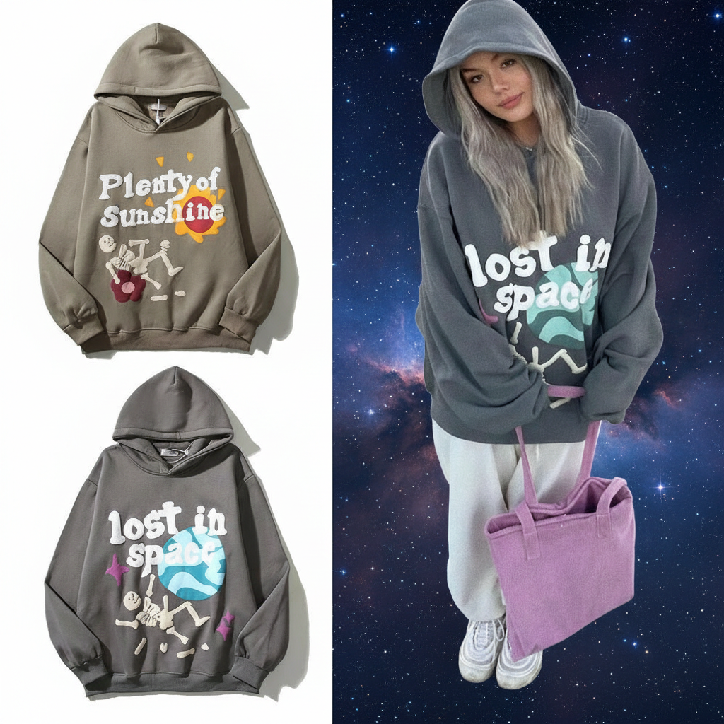 Broken Planet Hoodie, comfy oversized design with playful “Plenty of Sunshine” and “Lost in Space” prints, perfect for streetwear style and casual layering.