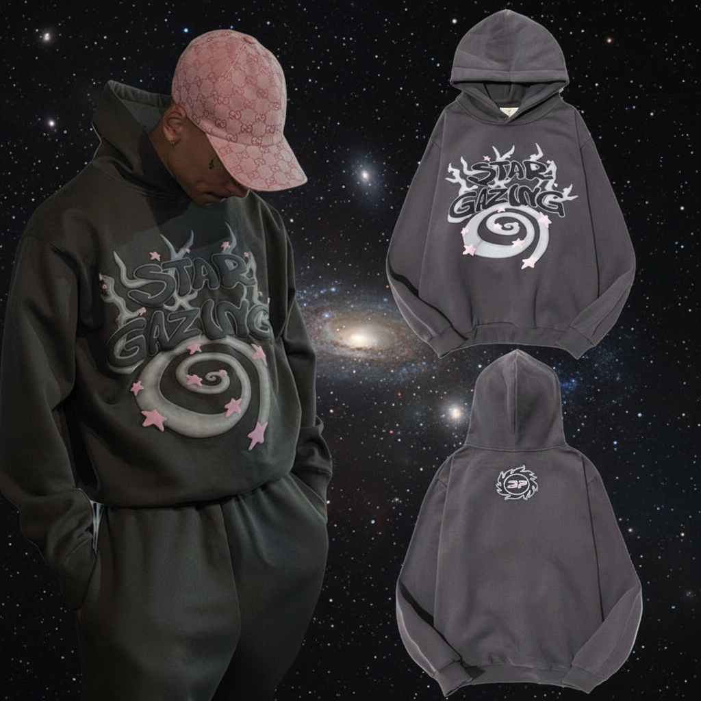 Broken Planet hoodie, dark grey Stargazing print, cozy streetwear style, soft fabric, perfect for casual wear and outdoor adventures.