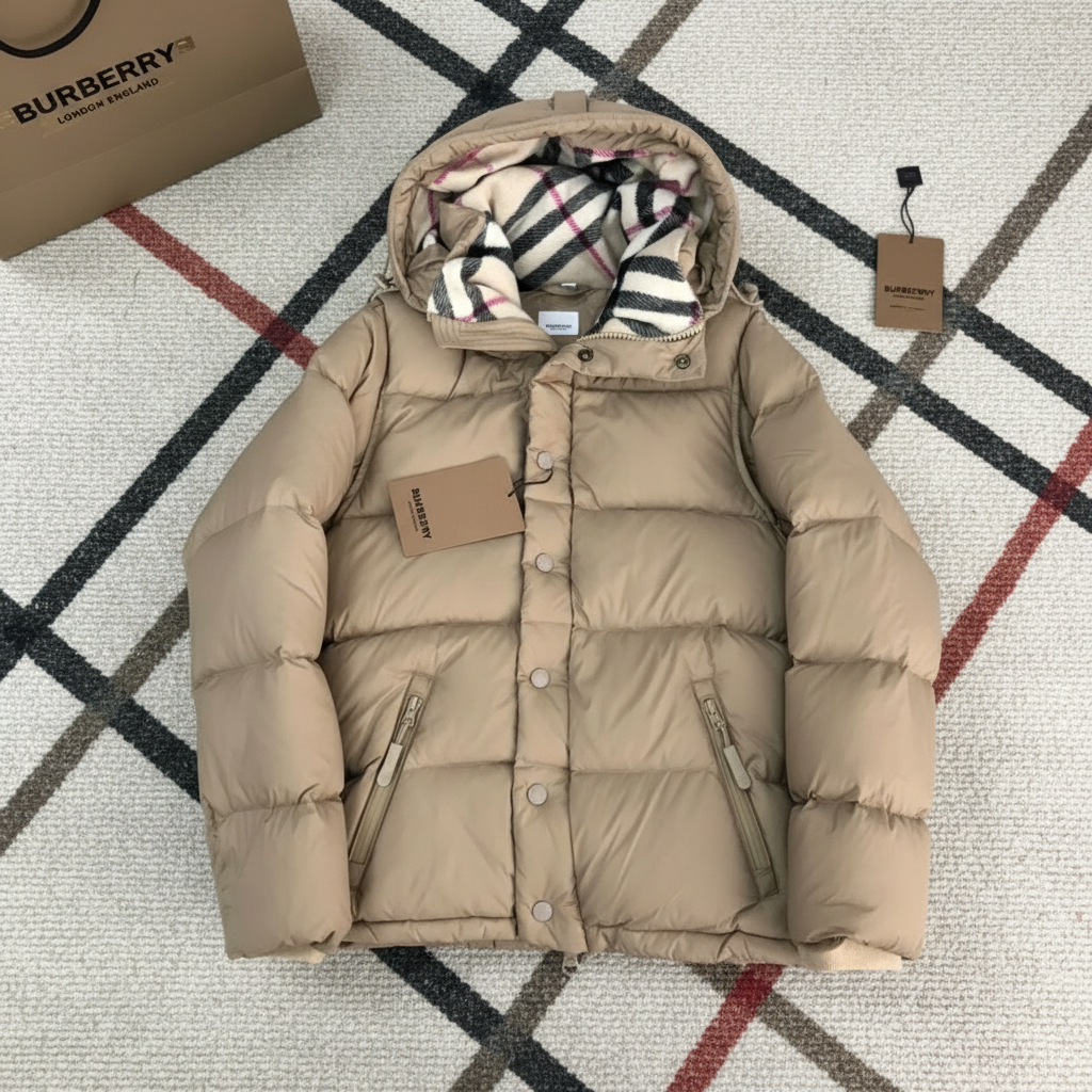 Burberry Beige Down Jacket with Hood and Iconic Check Lining, Warm Winter Coat for Men and Women, Stylish Outdoor Puffer