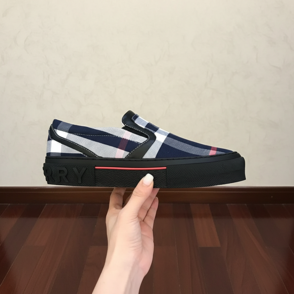 Burberry men’s slip-on sneakers with iconic blue check pattern, black sole, and red detail, offering stylish comfort for casual wear and everyday fashion.