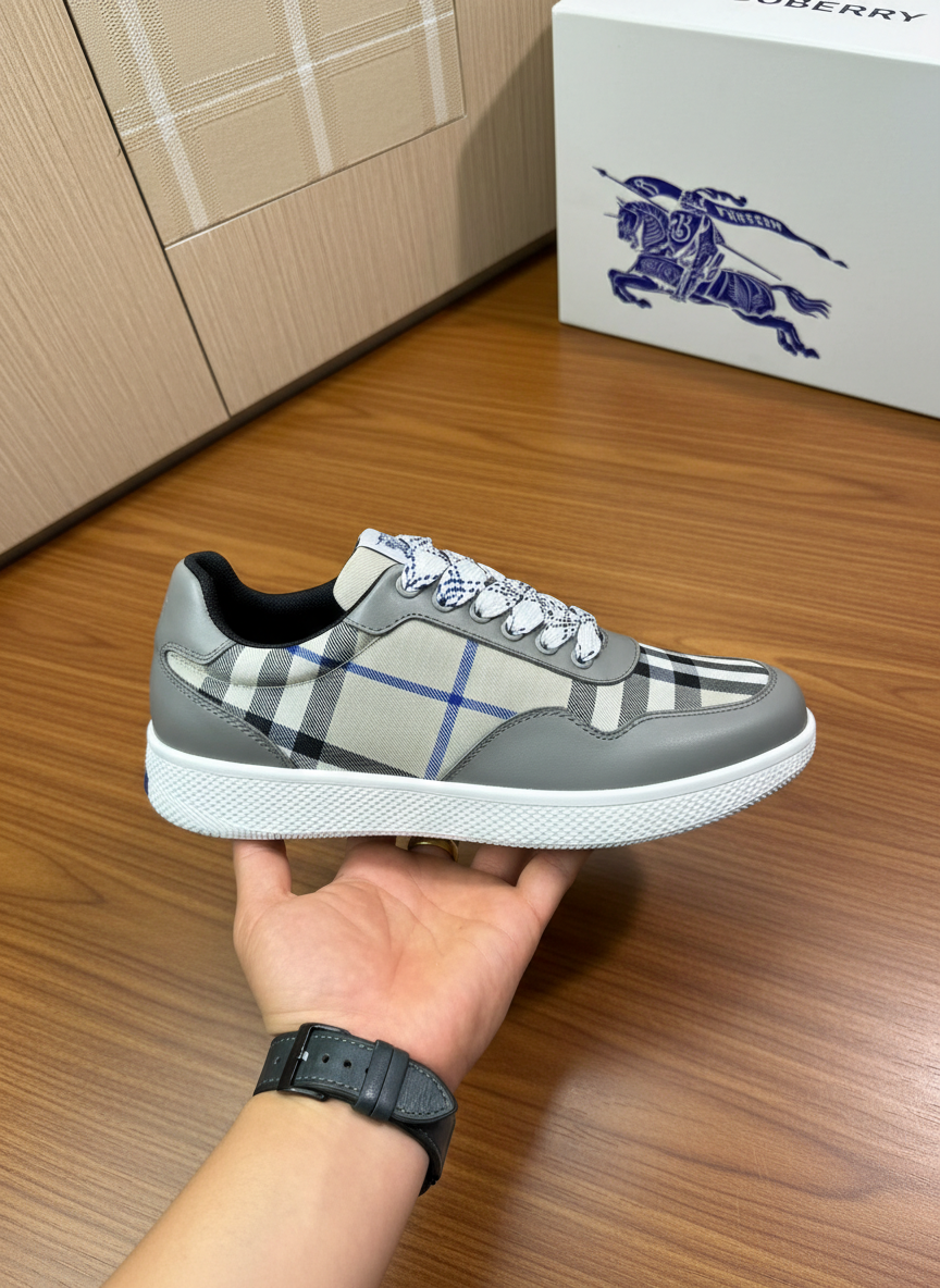 Burberry men’s grey check sneakers, stylish low-top design with signature pattern, lace-up closure, and comfortable rubber sole for everyday wear.