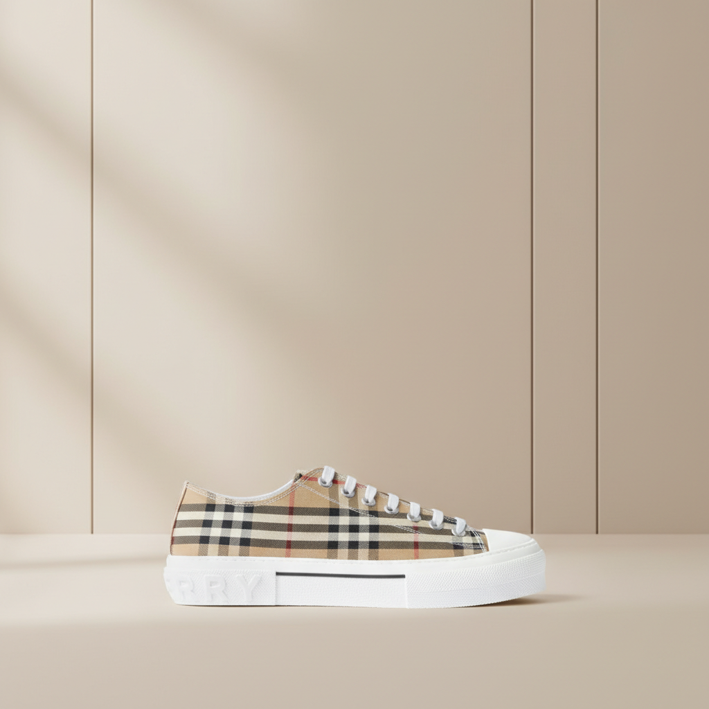 Burberry Men’s Vintage Check Canvas Sneakers with lace-up design, durable rubber sole, and iconic heritage pattern for stylish casual wear.