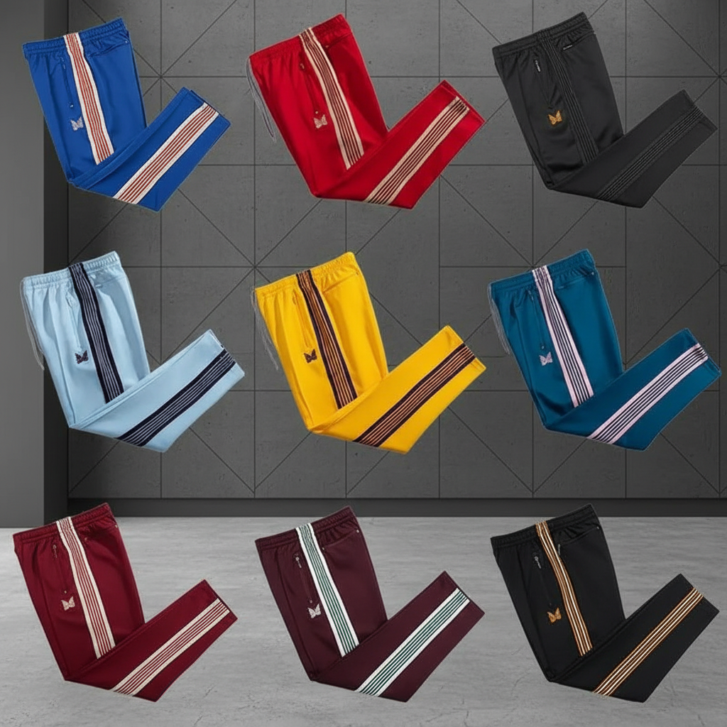 PantsNeedles stylish stripe track pants with butterfly logo, available in multiple colors, perfect for casual wear, sports, and street fashion.