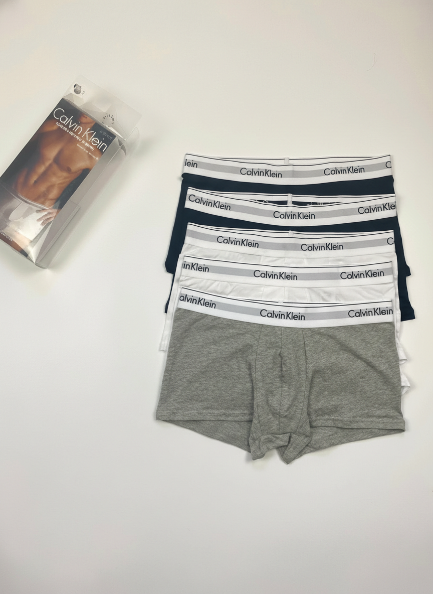 Calvin Klein men’s cotton stretch boxer briefs, 4-pack in black, white, and grey, featuring signature logo waistband for all-day comfort and style.