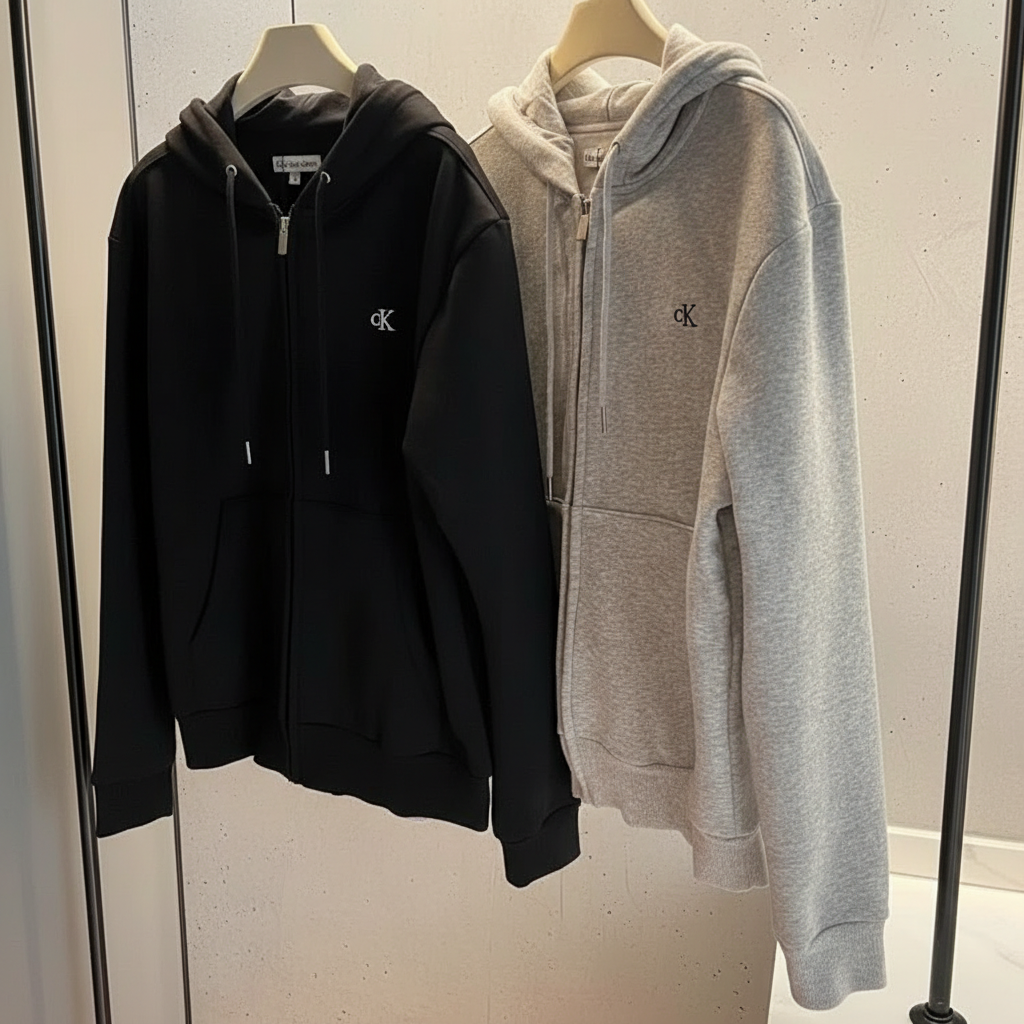 Calvin Klein zip-up hoodies for men, classic black and grey, soft cotton blend, casual sport style, adjustable drawstring hood, great for everyday wear.