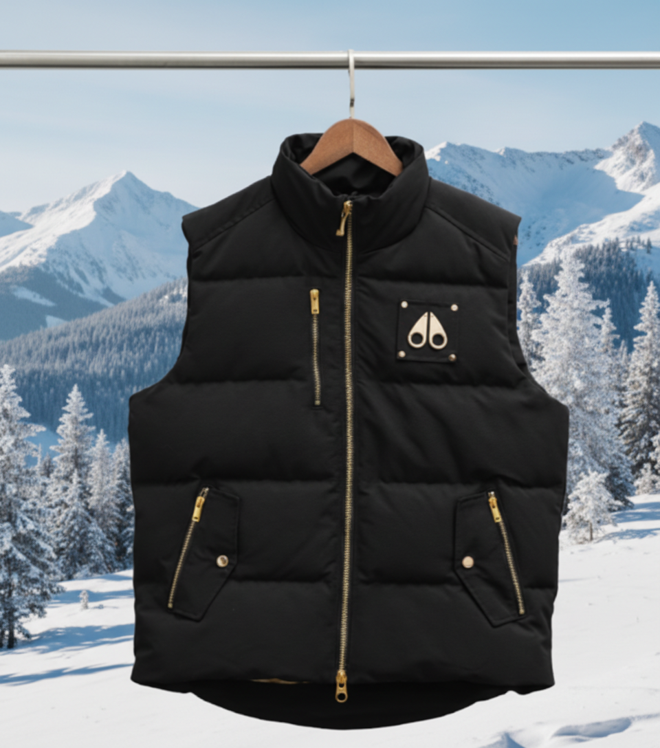 Canada Goose Black Down Vest with gold zipper accents, warm sleeveless design, premium insulation for outdoor winter wear, stylish and durable for cold weather.