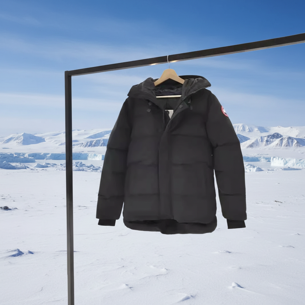 Canada Goose Men’s Black Down Jacket, warm winter parka with hood, premium insulation, windproof and water-resistant for extreme cold weather.