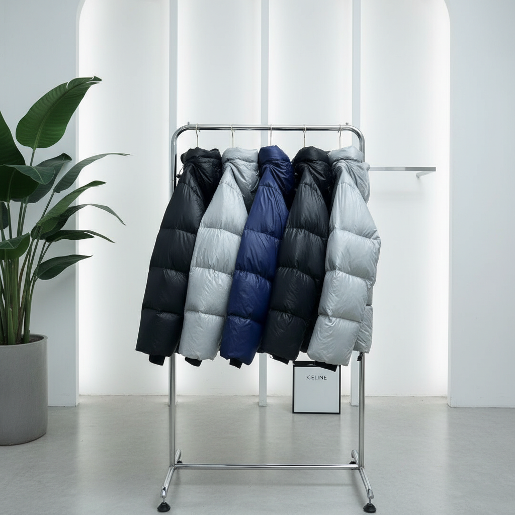 Canada Goose down jackets in black with red logo, silver with red logo, blue with red logo, black with black logo, and grey with black logo for ultimate winter warmth.