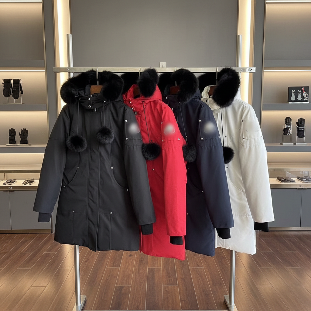 Canada Goose women’s winter jackets with fur hood, warm insulated design, available in black, red, navy, and white, perfect for cold weather outdoor wear.