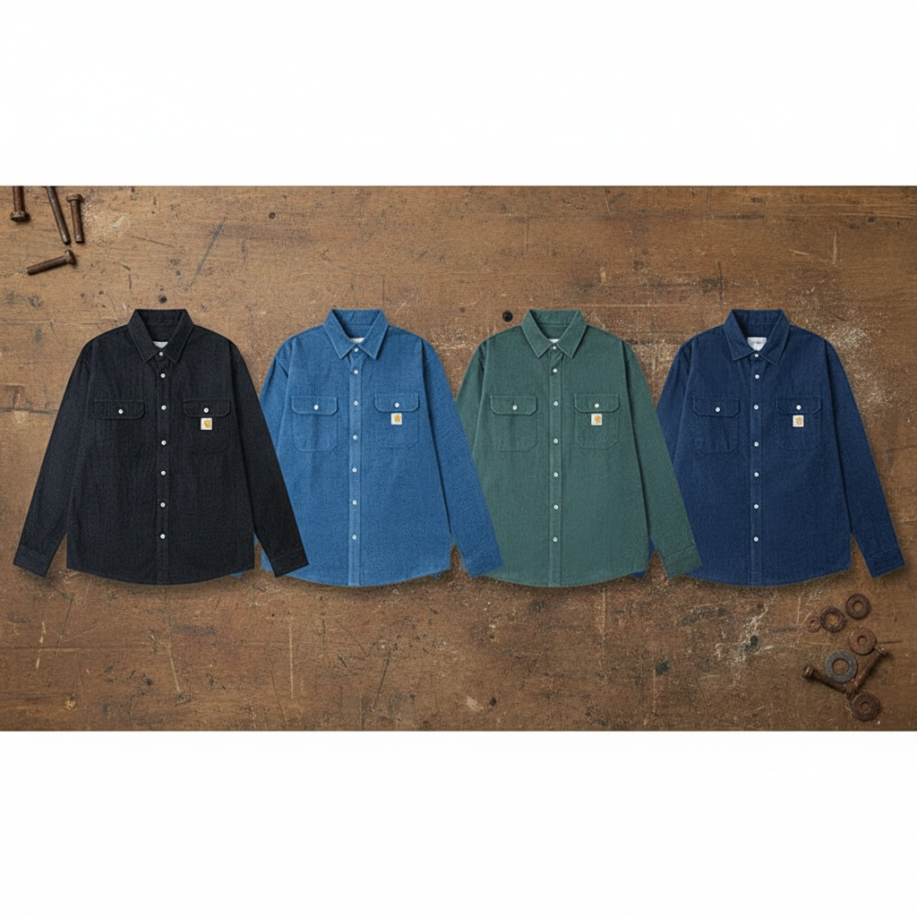 Carhartt men’s long sleeve corduroy shirts, classic workwear style with chest pockets, durable fabric, available in black, blue, green, and navy for casual or outdoor wear.