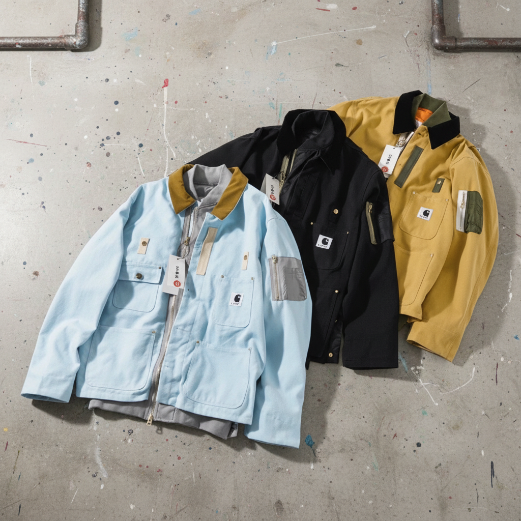 Carhartt men’s outdoor work jackets, durable cotton, multi-pocket design, available in light blue, black, and khaki, perfect for casual wear and all-season comfort.