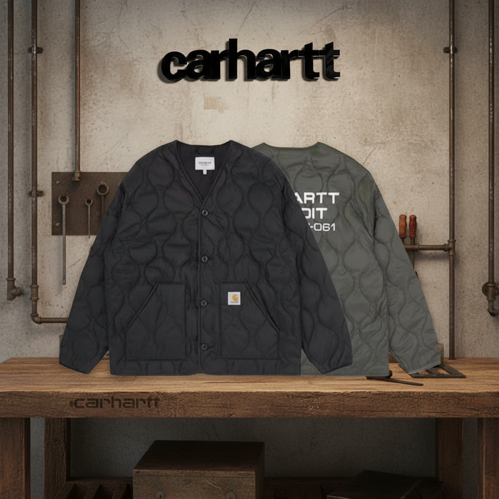 Carhartt quilted jacket, lightweight and durable outerwear with front button closure, patch pockets, and stylish logo detail, perfect for casual and outdoor wear.