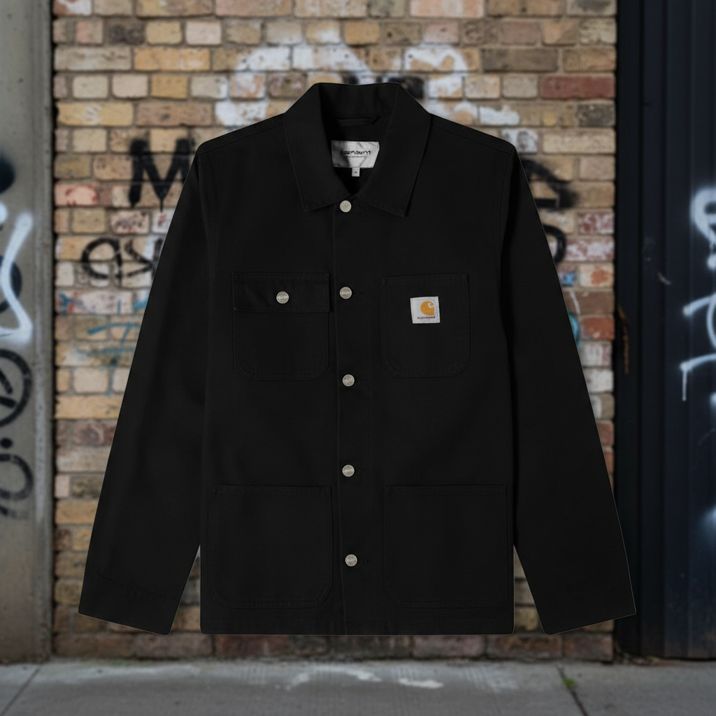 Carhartt Men’s Black Work Jacket, durable cotton canvas, classic button-up design, functional pockets, ideal for outdoor, casual, and streetwear style.