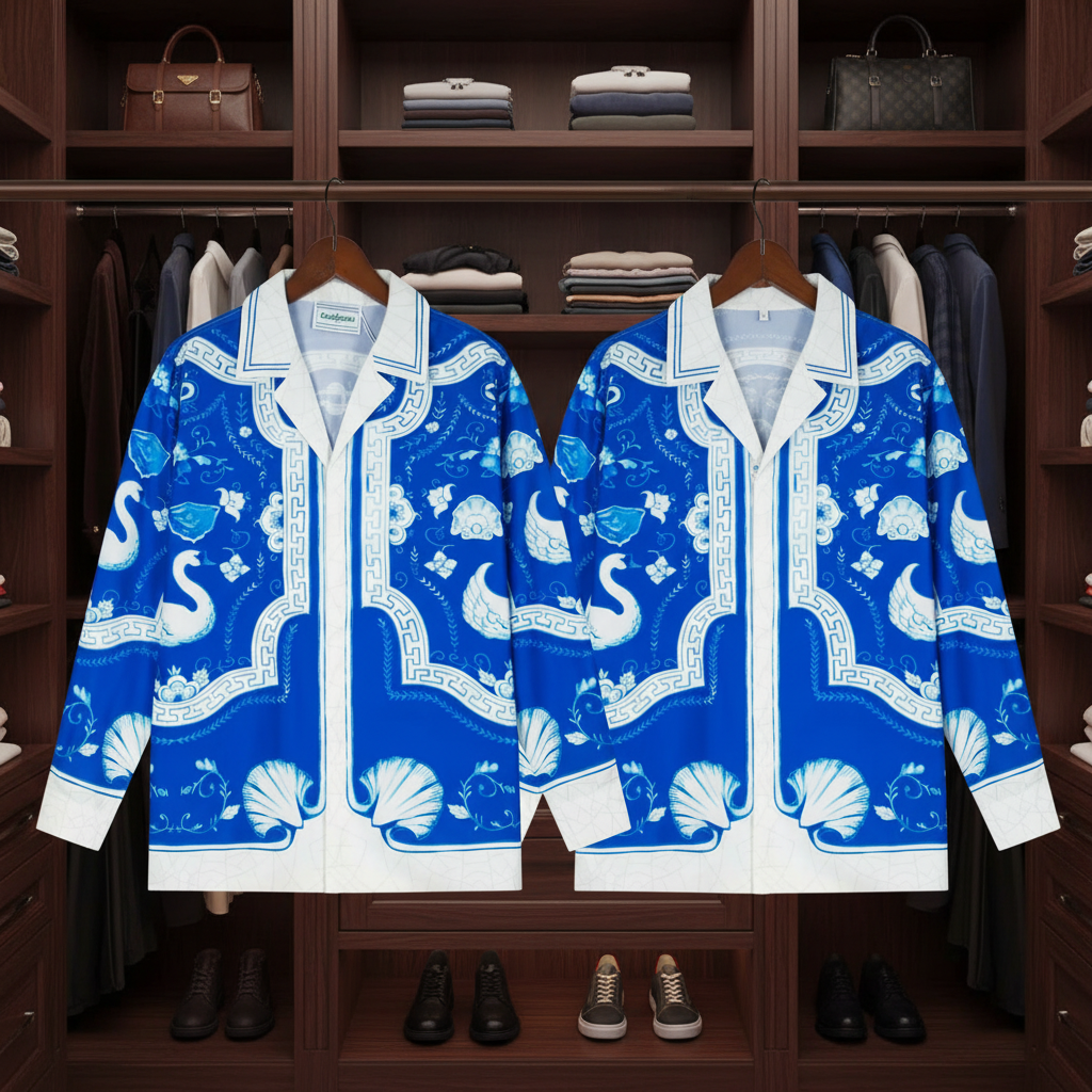 / Casablanca Blue White Print Shirt, Swan Vase Geometric Design