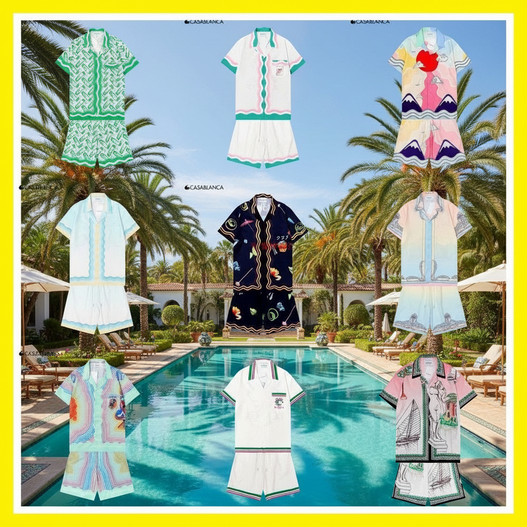 Casablanca men’s summer short-sleeve shirt and shorts set, lightweight breathable fabric, vibrant printed patterns, perfect for casual wear, beach vacations, and resort style outfits.