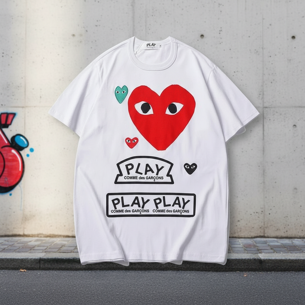 COMME des GARÇONS PLAY T-Shirt featuring iconic heart logo design, premium cotton fabric, unisex streetwear style, casual fashion top for everyday wear.