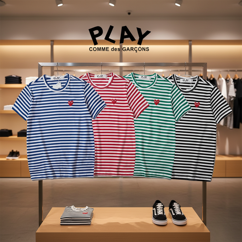 COMME des GARÇONS Play striped T-shirt with iconic heart logo, casual unisex style, available in blue, red, green, and black for trendy everyday wear.