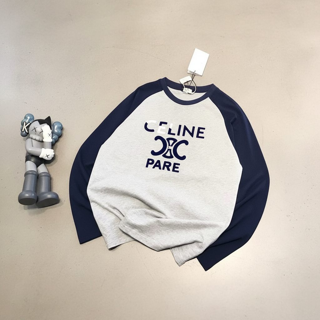 CEL Paris casual long sleeve baseball T-shirt, grey front with navy raglan sleeves, soft cotton fabric, trendy streetwear style for men and women.