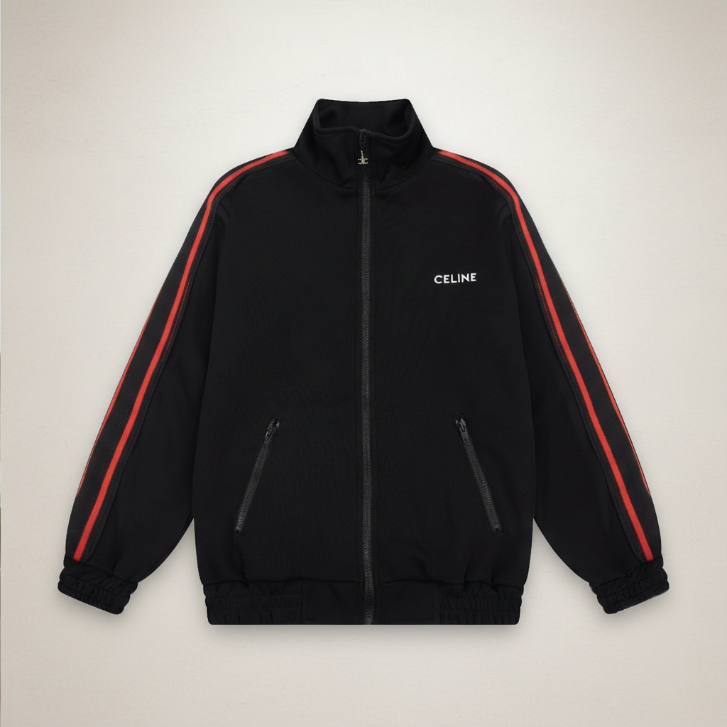 CELINE Black Track Jacket with Red Stripes, Full Zip, High Collar, and Side Pockets, Stylish Sportswear for Men and Women