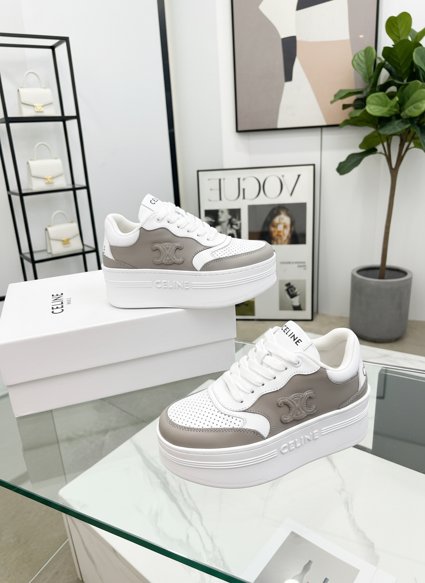 CELINE Women’s Platform Sneakers, white and grey leather, breathable design, iconic logo, stylish comfort for casual wear and street fashion.