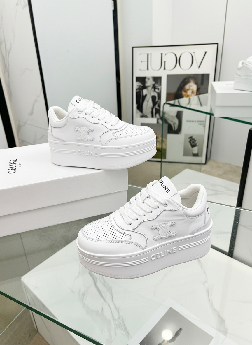 CELINE Women’s White Platform Sneakers, stylish leather design with signature logo, breathable comfort, perfect for casual wear and elevating any outfit.