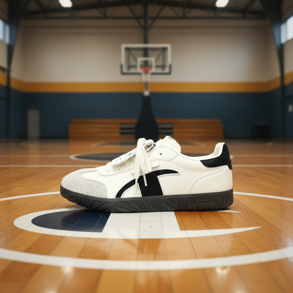 Champion men’s casual sneakers, white and black leather design, durable rubber sole, stylish low-top sports shoes perfect for everyday wear and skateboarding.