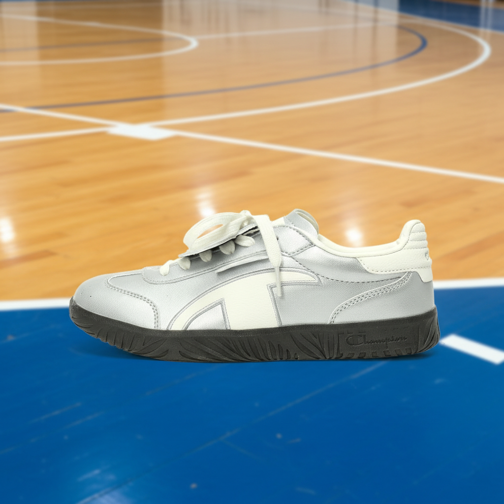 Champion silver leather sneakers with black sole, stylish low-top design, lace-up closure, and cushioned comfort perfect for casual wear and sports activities.