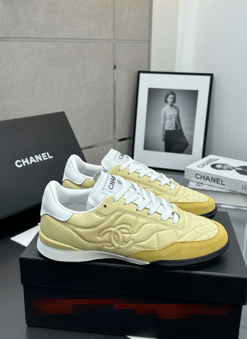Chanel beige quilted leather sneakers with signature logo, white accents, and black sole, offering luxury style and comfort for everyday wear.