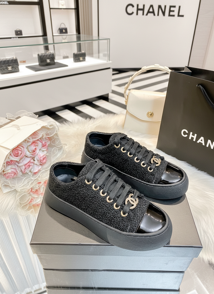 Chanel Women’s Black Tweed Sneakers with Glossy Toe Cap, Luxury Designer Casual Shoes, Comfortable Lace-Up Style for Everyday Fashion Wear