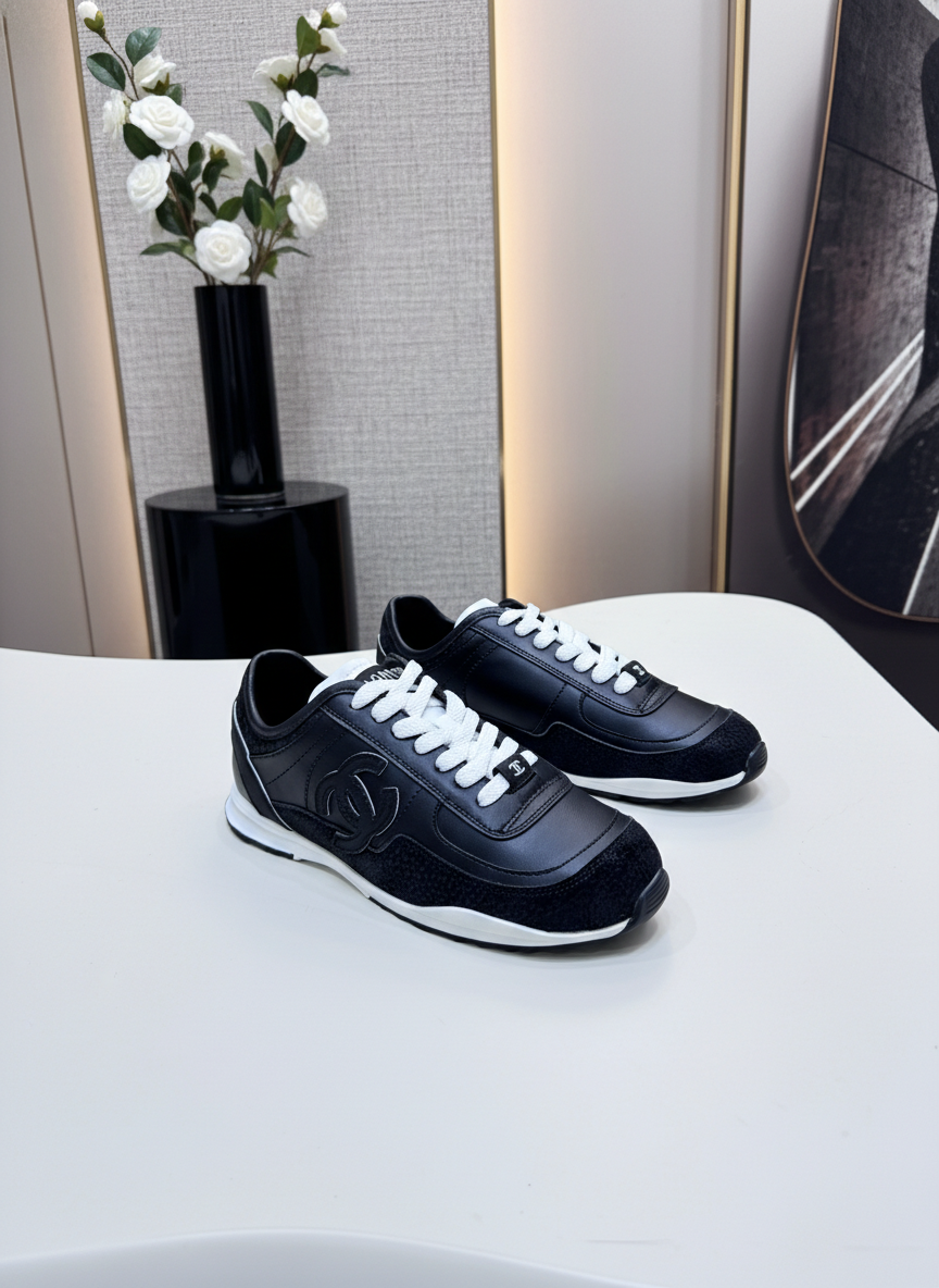 Chanel black leather sneakers with iconic logo, white laces, and comfortable sole, perfect for casual style and luxury fashion lovers.
