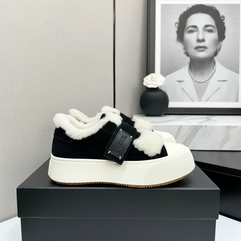 Chanel black suede platform sneakers with plush shearling lining, stylish Velcro strap, and durable sole for premium comfort and winter fashion.