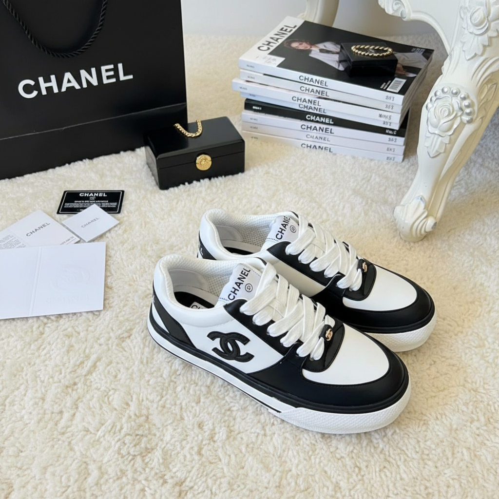 Chanel black and white luxury sneakers, stylish leather design with iconic logo, perfect for casual wear, sports, and fashion lovers seeking elegance and comfort.