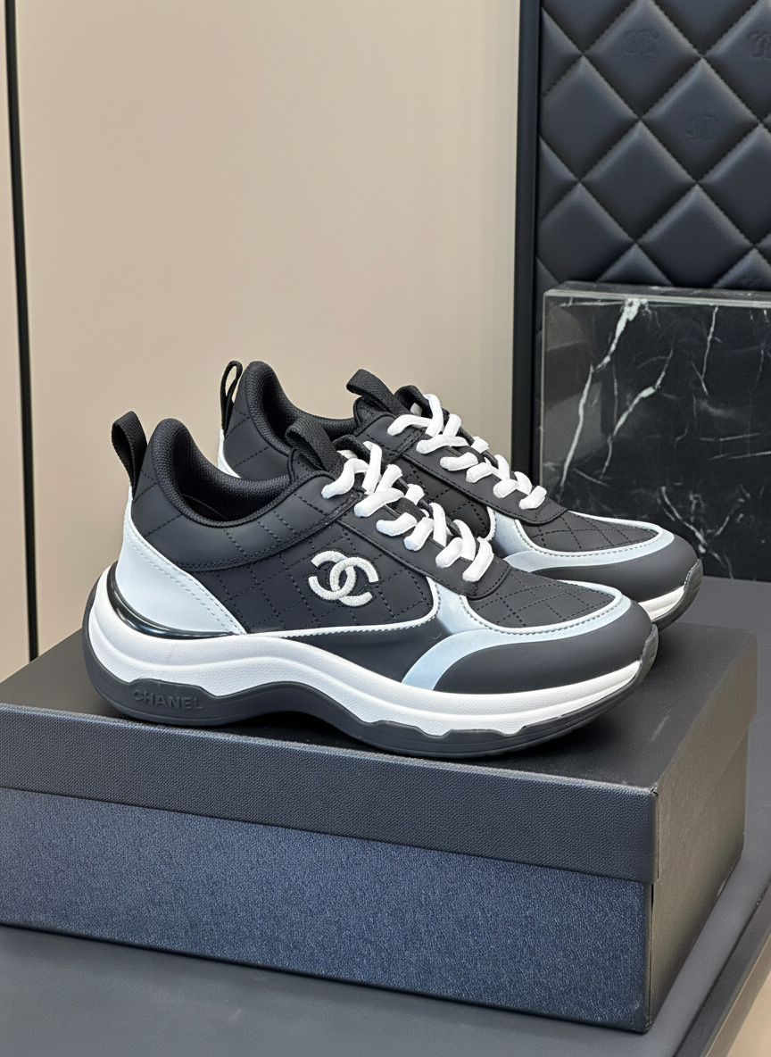 Chanel black and white luxury sneakers, stylish quilted design with iconic logo, premium comfort for casual or sport, perfect for fashion-forward looks.