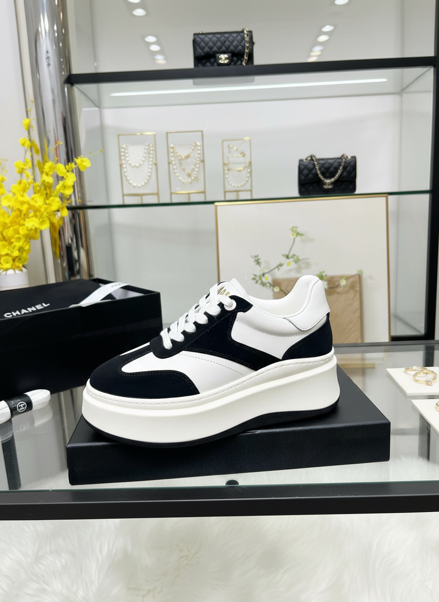 Chanel black and white platform sneakers, stylish leather design with lace-up closure, perfect for casual wear and adding luxury to your everyday fashion.