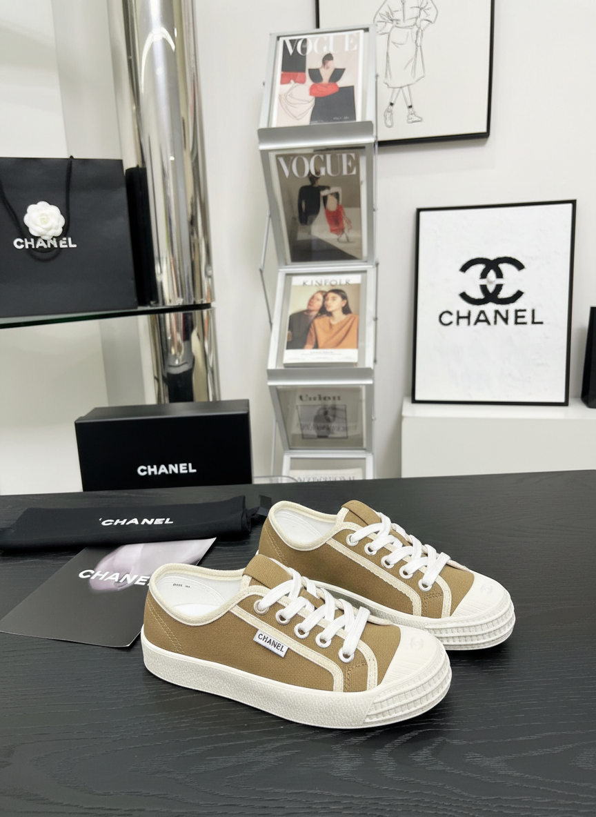 Chanel canvas sneakers in khaki with white rubber sole and lace-up design, offering classic style and comfort for everyday casual wear.