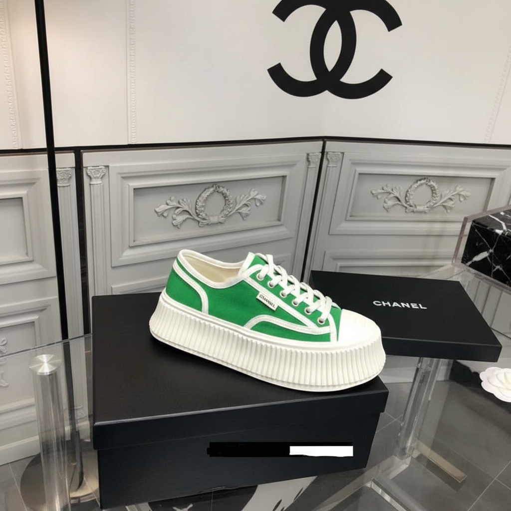 Chanel Green Canvas Platform Sneakers with white trim, lace-up design, and bold textured sole for stylish comfort and luxury fashion appeal.