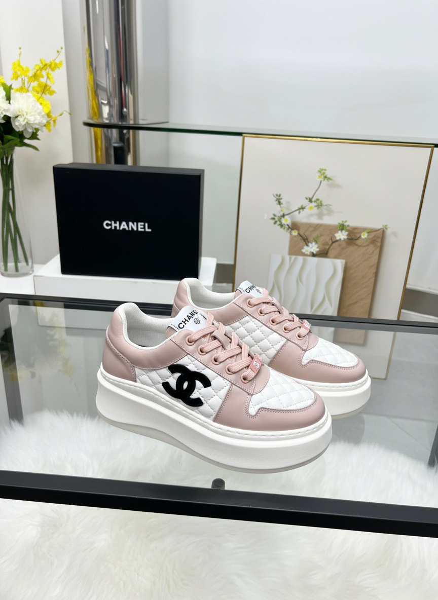 Chanel Women’s Pink & White Quilted Leather Platform Sneakers with Iconic Logo, Stylish Comfort for Casual Luxury Fashion