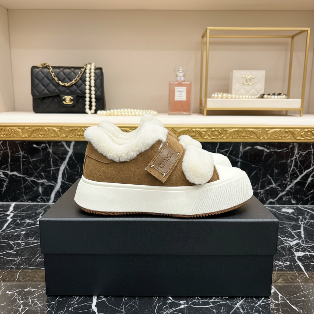 Chanel shearling suede sneakers with plush lining, slip-on design, and chunky white sole for cozy winter style and all-day comfort.