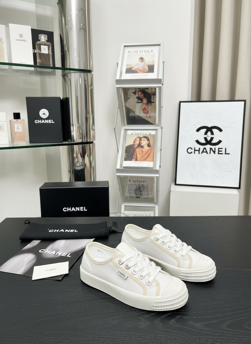 Chanel White Canvas Sneakers, stylish low-top design with lace-up closure, premium comfort sole, perfect for casual wear and adding luxury elegance to your outfit.