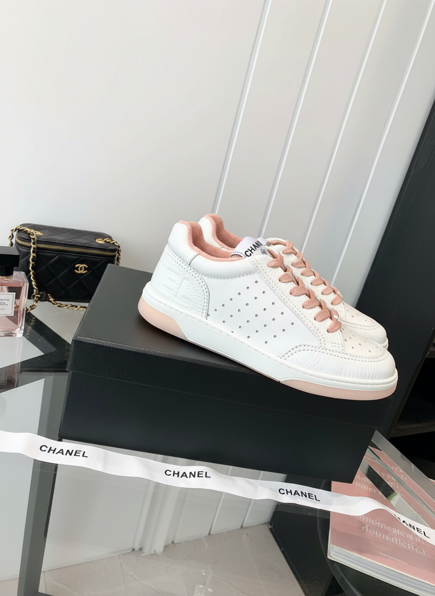 Chanel women’s white leather sneakers with pink accents, premium comfort, stylish perforated design, perfect for casual and sporty outfits.