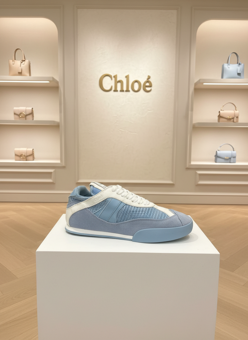 Chloe light blue mesh and suede sneakers with white leather trim, stylish low-top design, perfect for casual wear and everyday comfort.