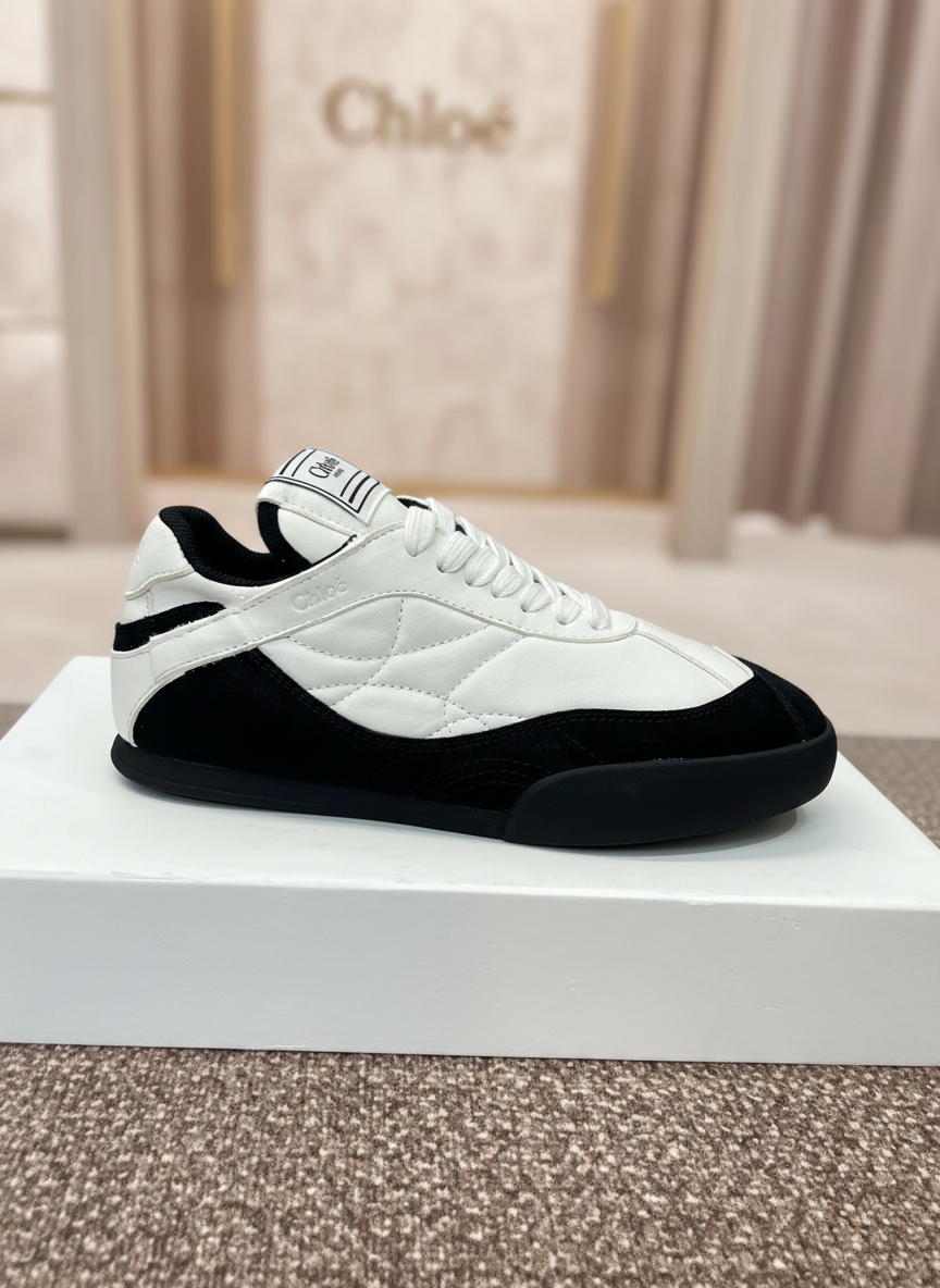 Chloe women’s black and white leather sneakers, stylish low-top design with quilted panels, lace-up closure, and durable rubber sole for everyday comfort and fashion.